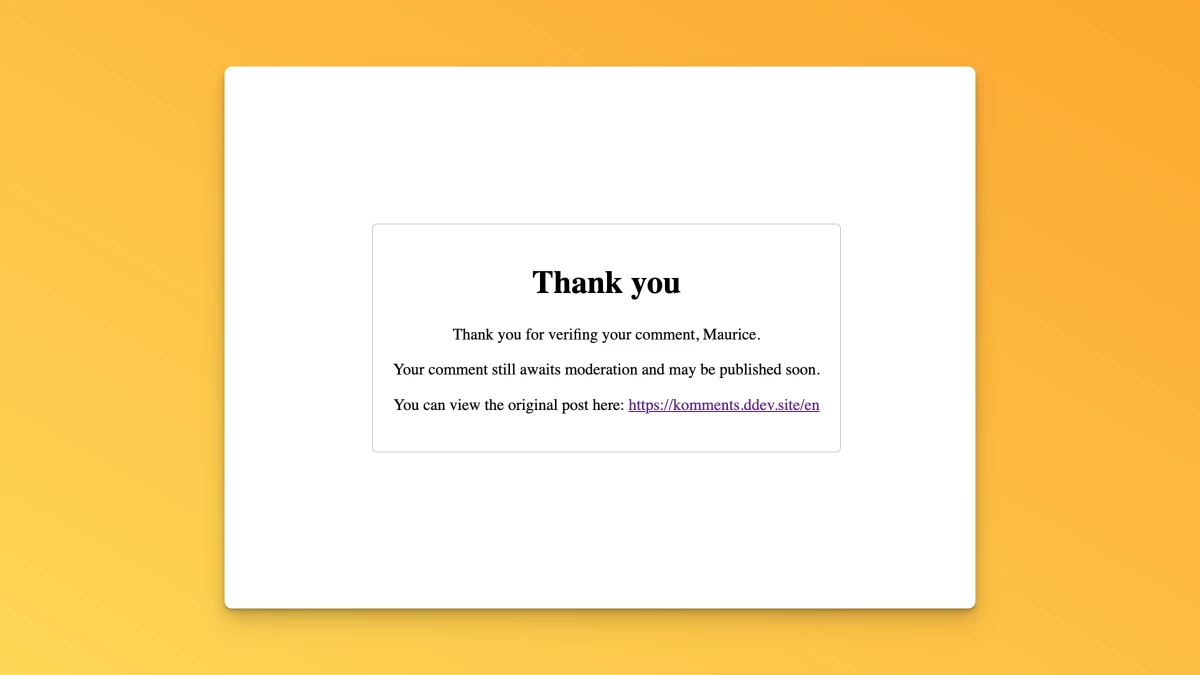 Make sure to add the necessary code if you want to display details of the comment. You can find the original template here: https://github.com/mauricerenck/komments/blob/main/templates/pages/comment-verified.php